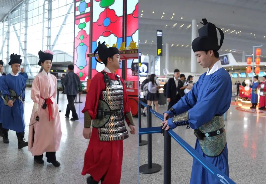 多名旅客发布的视频显示,2月2日,在海南海口美兰国际机场的工作人员全员也身着汉服亮相,保安化身“明代武士”,服务台人员则装扮成典雅大方的“大家闺秀”,吸引不少旅客拍照。2日,山西大同南站古装仪仗队霸气迎宾的视频也刷屏网络:穿着大明侍卫服装的演员在出站口大喊“恭迎郡主世子回家”,现场还有宫装侍女表演舞蹈,仪式感满满。