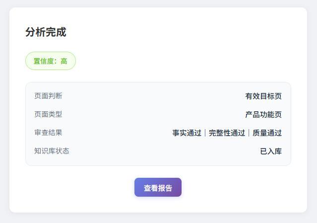 2. 完成页改造:以前只扔给用户一个干巴巴的“高/低置信度”。现在,我把后端的页面判断、页面类型、审查结果、知识库状态,全翻译成大白话亮在台面上,让用户一眼看懂这次分析的成色。