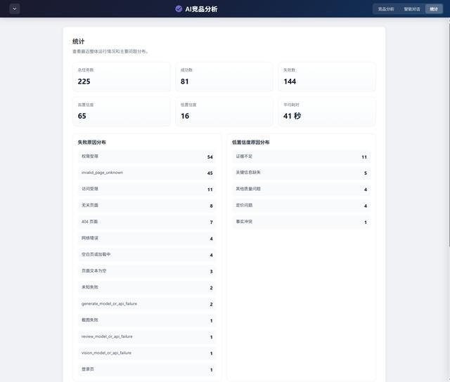 4. 数据大屏“秀肌肉”:我干脆把后端的统计接口接到了前端,单独做了一个“稳定性监控面板”。总任务数、成功/失败数、高/低置信度、平均耗时、失败原因、最近运行记录全部可视化。这不仅是给自己排雷用的,更是系统稳定性的最强力证!