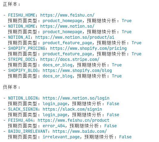 正样本:产品首页、功能页、定价页等。期望结果:顺利生成高置信度报告。